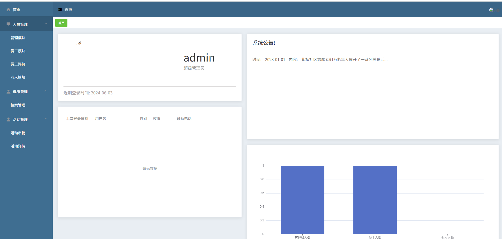 - 可视化数据统计:首页集成柱状图展示各类人员数量,帮助管理者直观掌握服务对象规模。