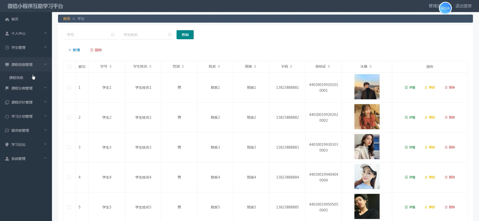 学生管理:查看、新增、编辑、删除学生用户信息(含头像、院系、班级等)