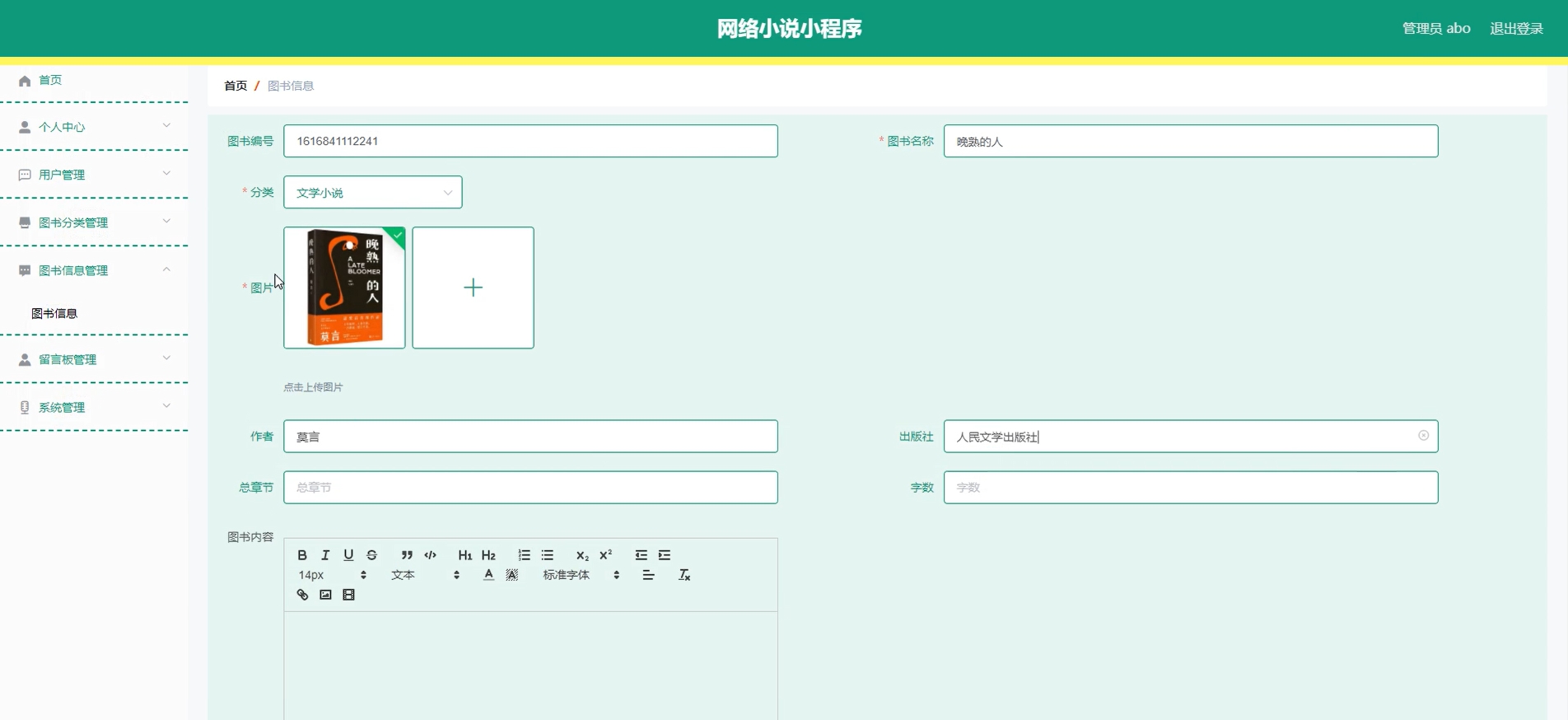 图书信息管理:发布、编辑、下架图书内容,支持上传封面图、输入章节内容、设置字数与总章节数