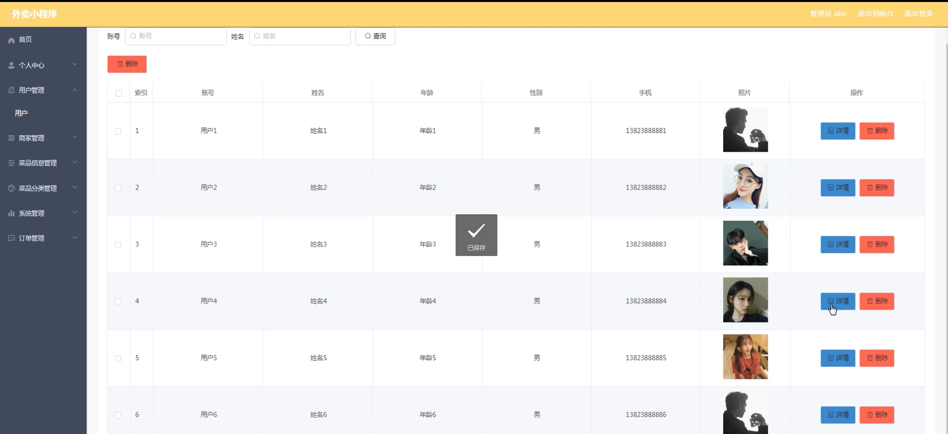用户管理:对注册用户进行增删改查,支持按账号、姓名搜索,查看用户详情